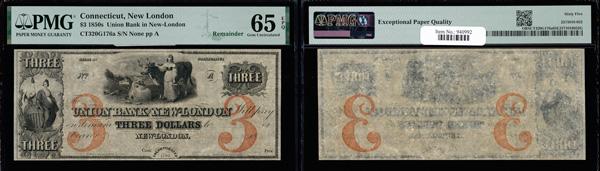 New London, Connecticut - Union Bank in New London $3 18__ G176a Remainder PMG Gem Uncirculated 65 EPQ (Haxby-G176a), exceptional paper quality, PMG graded Gem Uncirculated 65 EPQ. (Image)