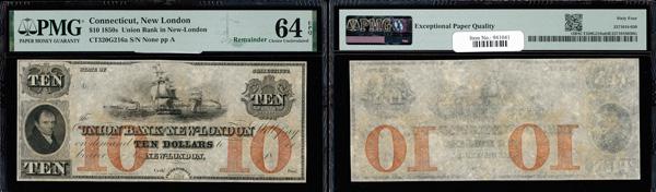 New London, Connecticut - Union Bank in New-London $10 18__ G230a Remainder PMG Choice Uncirculated 64 EPQ. (Haxby-G230a), exceptional paper quality, PMG graded Choice Uncirculated 64 EPQ. (Image)