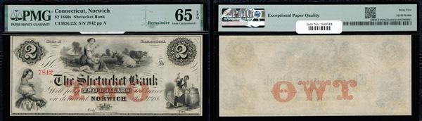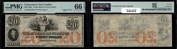 New London, Connecticut - Union Bank in New-London $20 18__ G230a Remainder PMG Gem Uncirculated 66 EPQ (Haxby-G230a), exceptional paper quality, PMG graded Gem Uncirculated 66 EPQ. (Image)