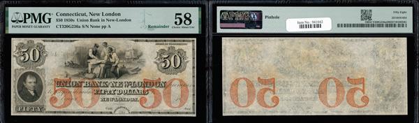 New London, Connecticut - Union Bank in New-London $50 18__ G236a Remainder PMG Choice About Unc 58 (Haxby-G236a), pinhole, PMG graded Choice About Uncirculated 58. (Image)