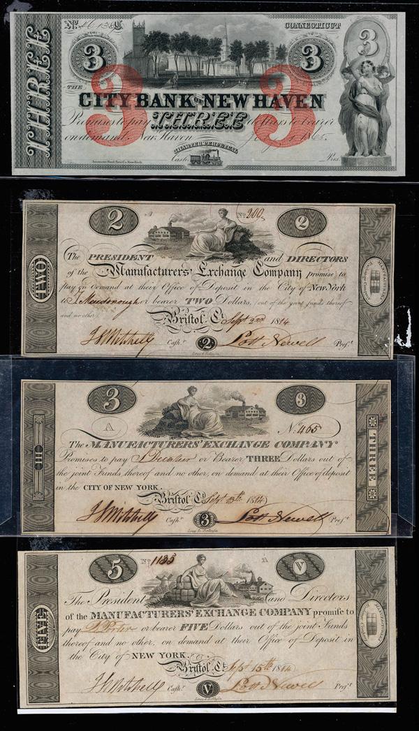 Group of (4) Connecticut Obsolete Banknotes: New Haven & Bristol, group includes: (1) City Bank Of New Haven New Haven, CT $3 1865 Remainder G36c AU; The Manufacturers' Exchange Company Bristol, CT Sep. 1814 G4 G6 G8 $2 $3 $5 Notes VF-XF (4 total). (Image)