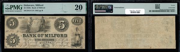 Milford, Delaware - Bank of Milford $5 June 1, 1854 DE-35 G8. PCGS Very Fine 20 (Haxby-G8), annotations, PMG graded Very Fine 20. (Image)