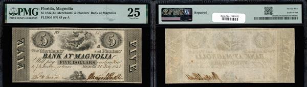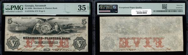 Savannah, Georgia - Merchants & Planters Bank $5 Dec. 24, 1856 G8a PMG Choice Very Fine 35 EPQ (Haxby-G8a), exceptional paper quality, PMG graded Choice Very Fine 35. (Image)
