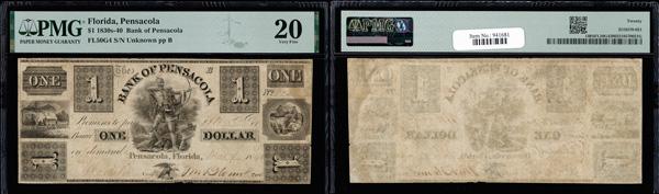 Pensacola, Florida - Bank of Pensacola $1 May 4, 1840 G4 PMG Very Fine 20 (Haxby-G4), PMG graded Very Fine 20. (Image)