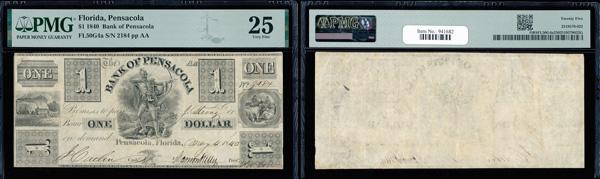 Pensacola, Florida - Bank of Pensacola $1 May 4, 1840 G4a PMG Very Fine 25 (Haxby-G4a), PMG graded Very Fine 25. (Image)