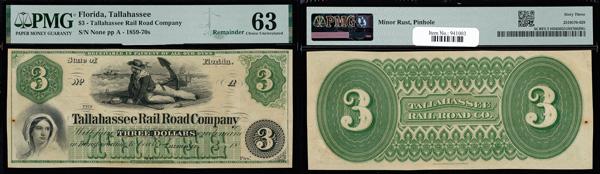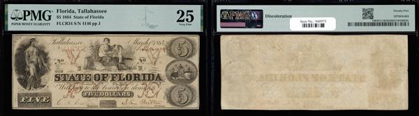 Tallahassee, Florida - State of Florida $5 Mar. 1, 1864 Cr. 34 PMG Very Fine 25 (Haxby-Cr. 34), discoloration, PMG graded Very Fine 25. (Image)