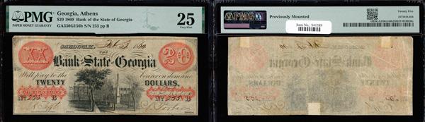 Athens, Georgia - Bank of the State of Georgia $20 Feb. 3, 1860 G156b PMG Very Fine 25 (Haxby-G156b), previously mounted, PMG graded Very Fine 25. (Image)