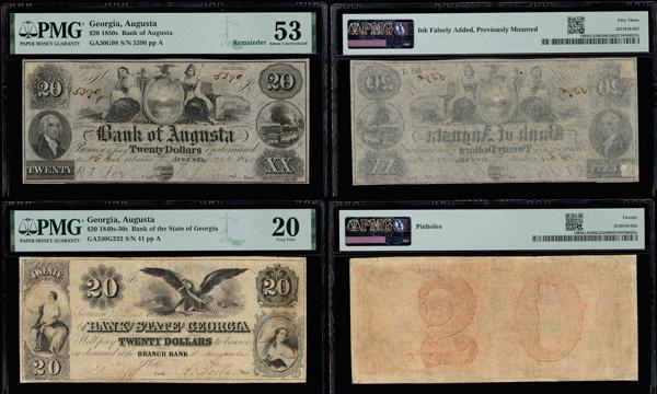 Lot of (2) Augusta Obsolete: Augusta, Georgia - Bank of Augusta $20 18__ Remainder G98 PMG About Unc 53 & Savannah, GA- Bank of the State of Georgia at Augusta Branch $20 Dec. 23, 1847 G232 PMG Very Fine 20 (Haxby-G98 G232) (total of 2 notes). (Image)