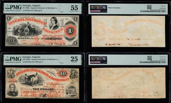 Lot of (2) Augusta Obsolete: Augusta, Georgia - Augusta Insurance & Banking Co. $1 Oct. 15, 1861 G6a PMG About Unc 55 & Augusta, GA - Augusta Insurance & Banking Co. $10 June 8, 1860 G30a PMG Very Fine 25 (Haxby-G6a G30a) (total of 2 notes). (Image)