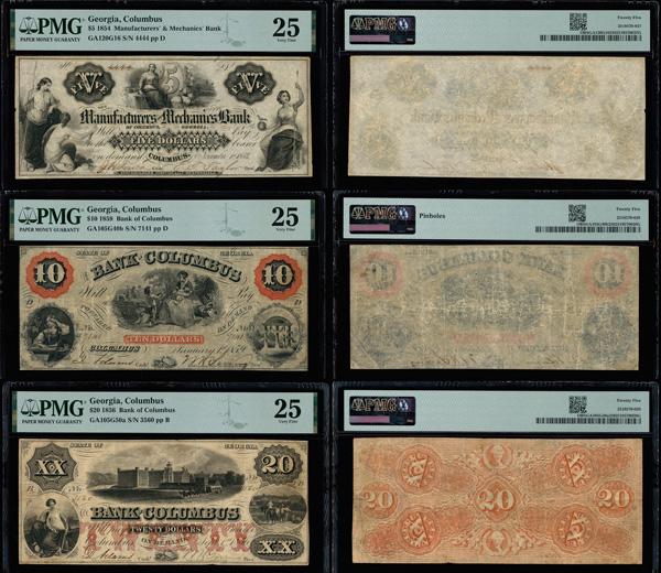 Lot of (3) Columbus, Georgia Obsoletes PMG Very Fine 25: Manufacturers and Mechanics Bank $5 Nov. 1, 1854 G16, Bank Of Columbus $10 Jan. 1, 1859 G40b, & Bank Of Columbus $20 Sep. 1, 1856 G50a (total of 3 notes). (Image)
