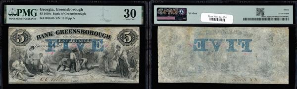 Greensborough, Georgia - Bank of Greensborough $5 May 10, 1858 GA-165 G6b PMG Very Fine 30 (Haxby-G6b), stains, PMG graded Very Fine 30. (Image)
