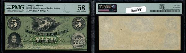 Macon, Georgia - Manufacturers Bank $5 May 1, 1862 G24a PMG Choice About Unc 58 (Haxby-G24a), PMG graded Choice About Uncirculated 58. (Image)