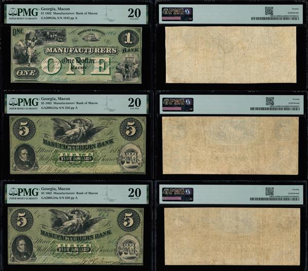 Lot of (3) Macon, Georgia Manufacturers' Bank Of Macon: (1) $1 May 1, 1862 G6a PMG Very Fine 20 & (2) $5 May 1, 1862 G24a PMG Very Fine 20 (total of 3 notes). (Image)