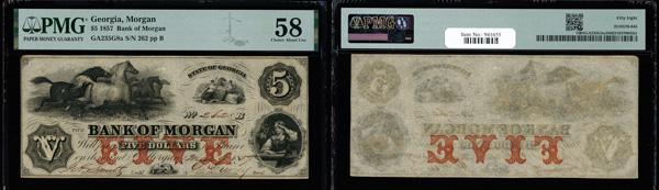 Morgan, Georgia - Bank of Morgan $5 Mar. 9, 1857 G8a PMG Choice About Unc 58 (Haxby-G8a), PMG graded Choice About Uncirculated 58. (Image)