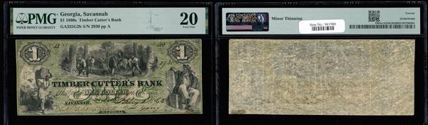 Savannah, Georgia - Timber Cutter's Bank $1 Jan. 1, 1863 G2b PMG Very Fine 20 (Haxby-G2b), minor thinning, PMG graded Very Fine 20. (Image)