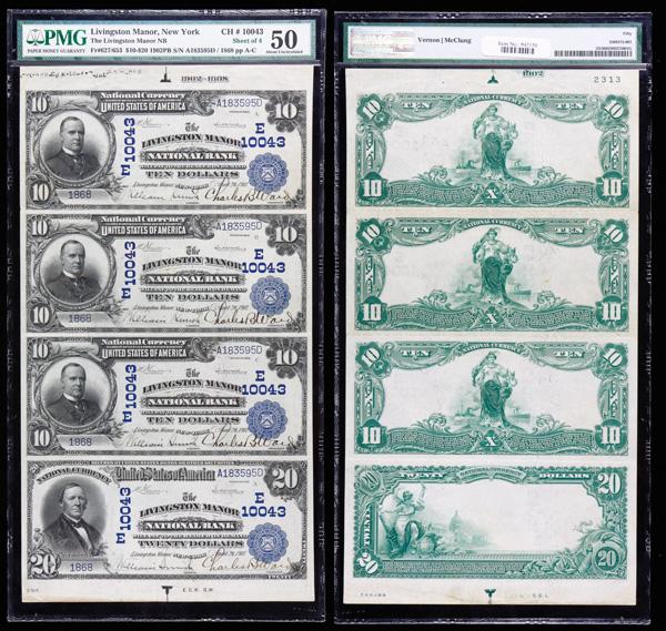 FR #627/653 $10-20 1902 PB CH #10043 Livingston Manor, New York Sheet of 4 PMG About Uncirculated 50, PMG graded Very Fine 25. Shipping charges apply - weight 1 lbs. (Image)