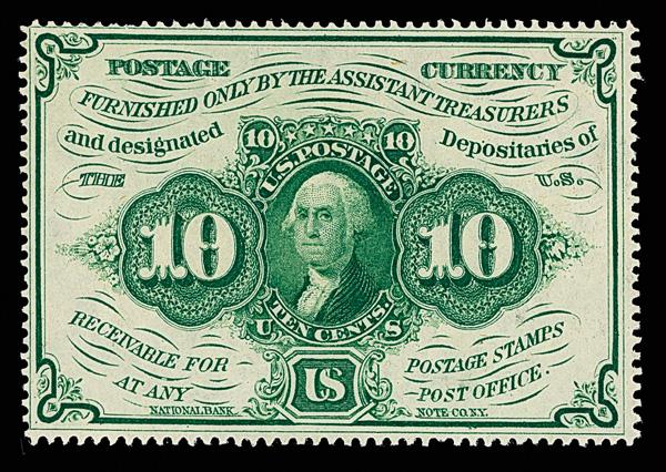 Fr. 1241 10¢ First Issue Perforated Edges (Fr-1241), Perforated edges, without ABNC monogram, Green with 10 Cents Washington stamp design in middle, back black, Choice XF to AU condition or better. (Image)