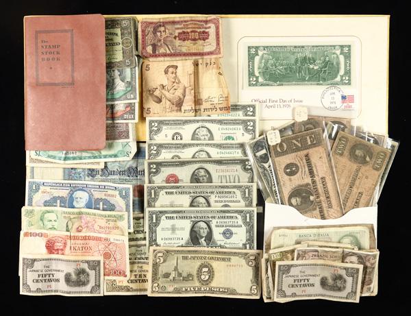 Worldwide, Banknote Collection including US, 1862-1967, lot of over 45 U.S. and world banknotes, highlighted by a group of Confederate States of America, notes, 1862, $100, Jackson and Montgomery handstamps on the back; 1864 issue $1, $2, $5, $10, and $20 in VG to VF; Series of 1899, U.S. Black Eagle Silver certificate in Fine to VF; Series of 1917, $1, U.S. Note; a Series of 1914, $10 FRN in Fine; a Series of 1935 F and 1957 $1 Silver Certificates in XF+: 9 $2 banknotes including a Series of 1928 G in VF; a crisp VF Bermuda, 5 Shillings, Queen Elizabeth II note; 4 examples of the $1 1937 Bank of Canada series in VG to VF; and an assortment of notes from Switzerland, Denmark, Germany, Philippines and numerous other locations; this is a wide ranging collection with a few better notes, an excellent lot for the beginning collector, eBay seller or dealer; please inspect, it will be well worth your while (45+ notes). Shipping charges apply - weight 1 lbs. (PDF for this Lot) (Image)