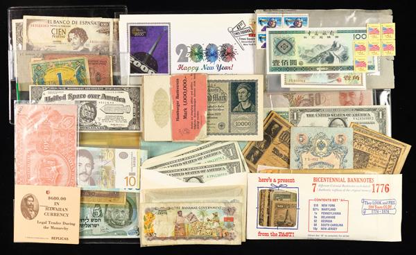 Worldwide Banknote Collection Melange, 1917-1976, lot of over 150 worldwide banknotes featuring over 50 examples of Germany, 1922 Reichs banknote, 10,000 Marks, VF to Choice VF; China includes a 1917, 1 Ruble Russo-Asiatic Bank note in Fine-VF; U.S. includes 1935 and 1957 Silver Certificates and $2 notes from 1928 to 1976; and, a large number of facsimile, reprint or modern advertising notes; interesting lot that deserves close inspection that might include a few surprises. (150+ notes). Shipping charges apply - weight 1 lbs. (Image)