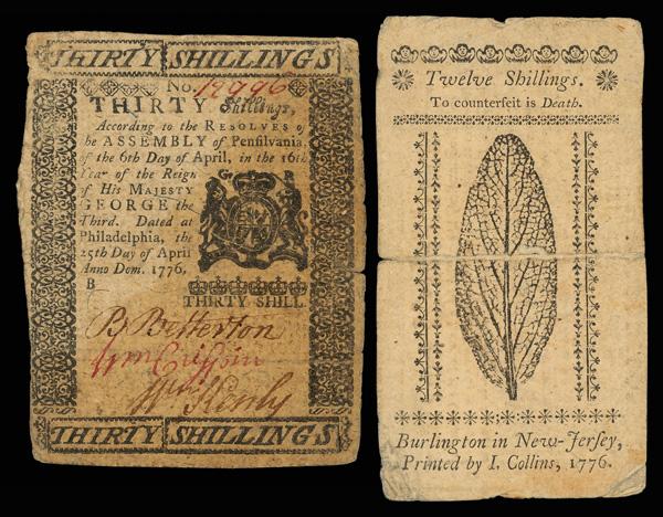 PA and NJ. Colinial Bankote Pair, Lot of 2 notes, Includes Philadelphia, PA., 30 Shillings, April 25th, 1776 colonial note, Fine to Choice fine; and, New Jersey, 12 Shillings, March 25, 1776, Fine. (Image)