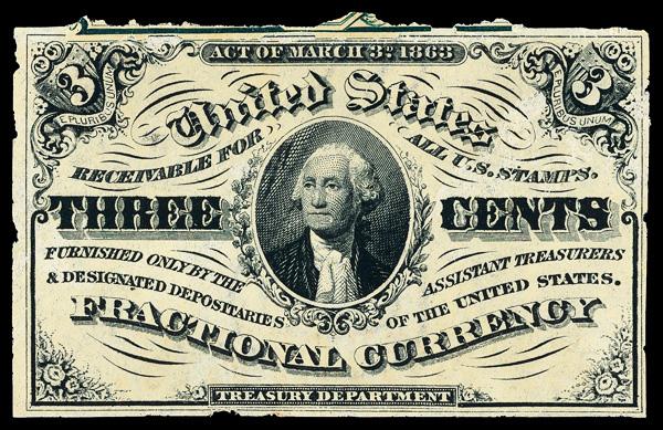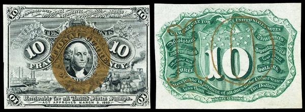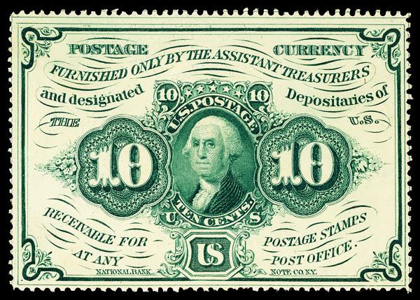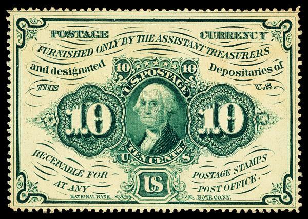 Fr. 1241 10¢ First Issue Perforated Edges (Fr-1241), Rothert-5, Perforated edges, with ABNC monogram, Green with 10 Cents Washington stamp design in middle, back black, Choice XF to AU condition or better. (Image)