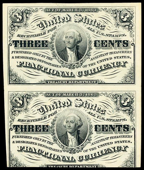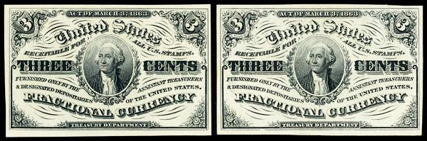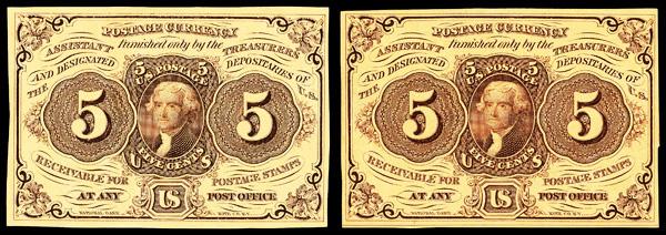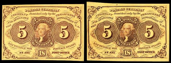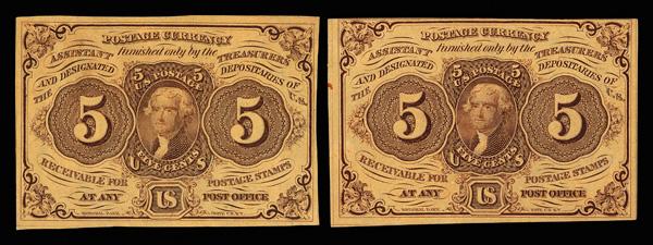 Fr. 1231 5 Cents First Issue Fractional Pair, No monogram (Fr-1231), Rothert-4, Lot of 2 notes, both with Straight edges, no ABNC monogram, Brown with 5 Cents Jefferson stamp design in middle, back black, printed on light yellow paper, Choice XF to AU condition. (Image)