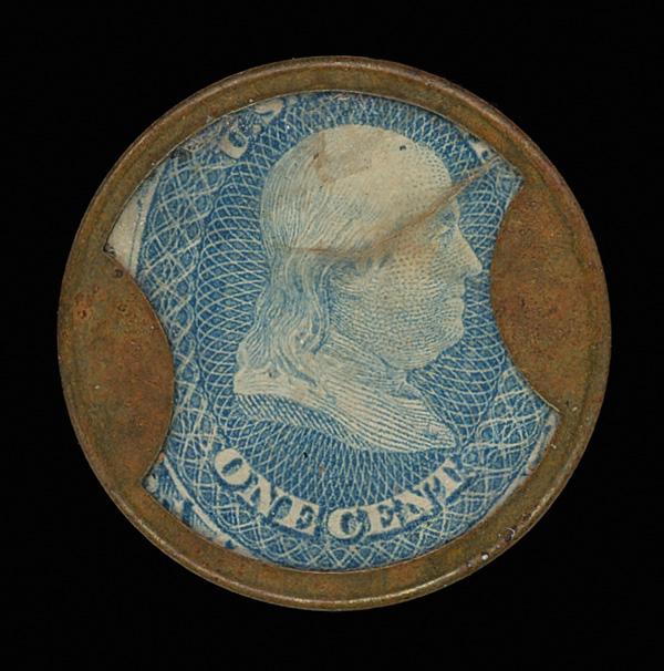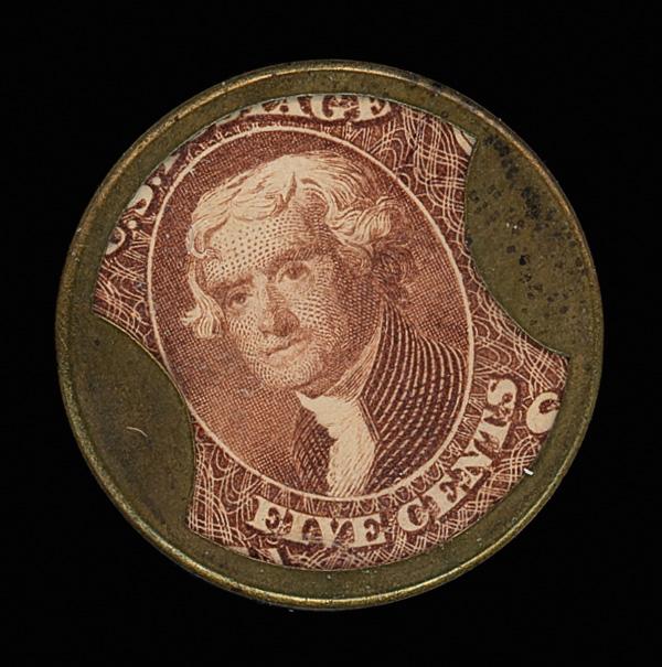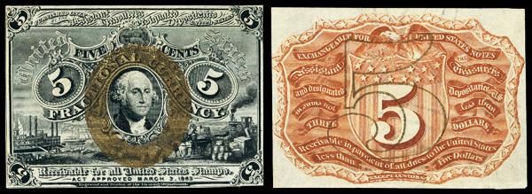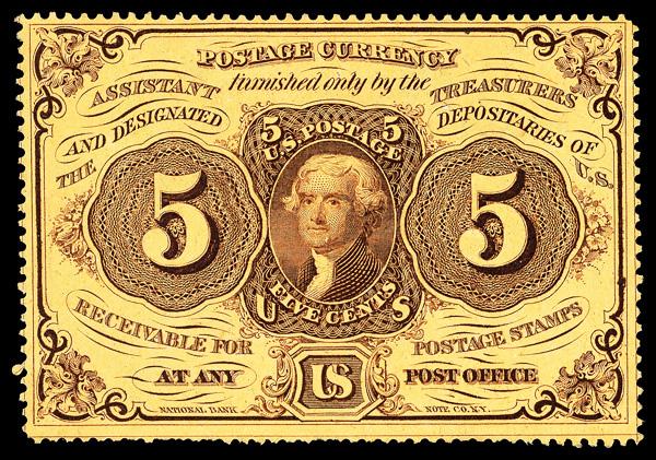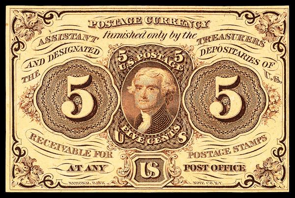 Fr. 1228 5 Cents First Issue, Perforated (Fr-1228), Rothert-1, Perforated edges, with ABNC monogram, Brown with 5 Cents Jefferson stamp design in middle, back black, printed on light yellow paper, Choice XF to AU condition or better. (Image)