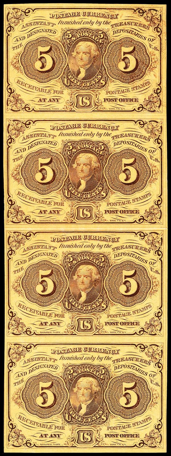 Fr. 1230 5 Cents First Issue Uncut Strip of 4 Notes (Fr-1230), Rothert-3, Uncut vertical strip of 4 notes, all with Straight edges, and ABNC monogram, Brown with 5 Cents Jefferson stamp design in middle, back black, printed on light yellow paper, Choice XF to AU condition. (Image)