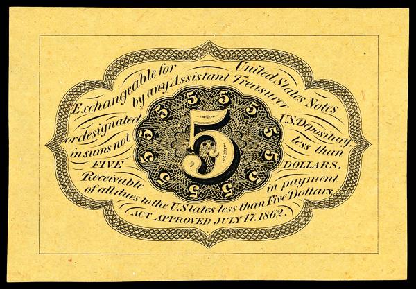 Fr. 1231-SP 5 Cents Specimen Reverse with Medium Wide Margins, Not from Shield (Fr-1231), Uniface back specimen with medium wide margins, not taken from a shield, no monogram, printed in black on light yellow paper, Choice XF to AU condition., Choice VF to XF condition or better. (Image)