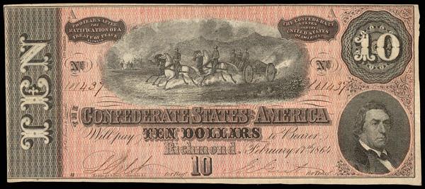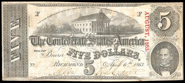 Group of (3) Confederate States Of America CSA Bank Notes, includes: (1) Fr. T-60 1863 $5 Confederate States Of America CSA Bank Note (VF) (2) Fr. T-59 1863 $10 Confederate States Of America CSA Bank Notes, VF-XF (3 notes). (PDF for this Lot) (Image)