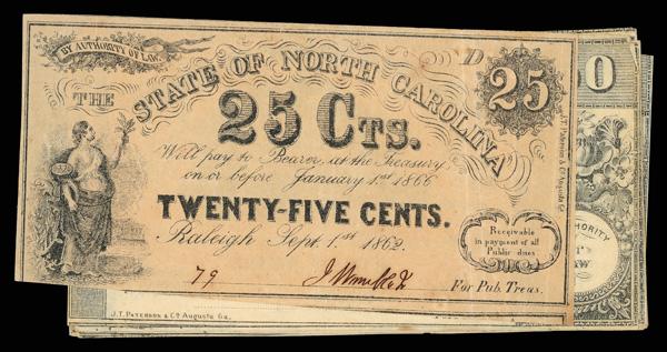 Confederacy, State of North Carolina, Lot of 10 Notes, 1862, Lot of 10 notes, 9 are 50 cent Denominations, Choice XF to Uncirculated, and 1 is a 25 Cent Denomination in XF-AU. Please inspect (10). (Image)