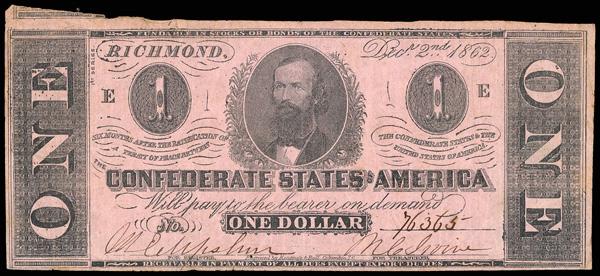 Group of (5) Confederate States Of America CSA Bank Notes, includes: (2) Fr. T-55 1862 $1 Confederate States Of America CSA Bank Notes, Fine condition (1) Fr. T-42 1862 $2 Confederate States Of America CSA Bank Note, Good-Fine condition (1) Fr. T-53 1862 $5 Confederate States Of America CSA Bank Note, Fine (1) Fr. T-52 1862 $10 Confederate States Of America CSA Bank Note, G-VG condition (1) Fr. T-59 1863 $10 Confederate States Of America CSA Bank Note, Fine; please inspect (6 notes total). (PDF for this Lot) (Image)