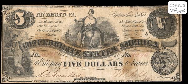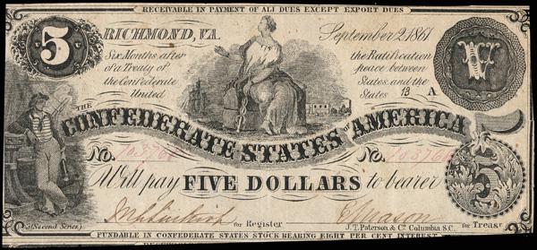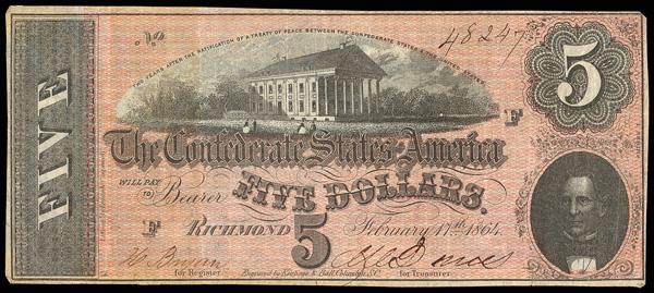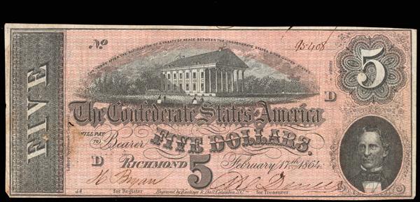 Group of (5) Confederate States Of America CSA Bank Notes, 1861, includes: (2) Fr. T-36 1861 $5 Confederate States Of America CSA Bank Notes, Fine condition (1) Fr. T-37 1861 Confederate States Of America CSA Bank Note, Good-VG condition (1) Fr. T-20 1861 Confederate States Of America CSA Bank Note, Fine (1) Fr. T-18 1861 Confederate States Of America CSA Bank Note, Good; please inspect (5 total). (PDF for this Lot) (Image)