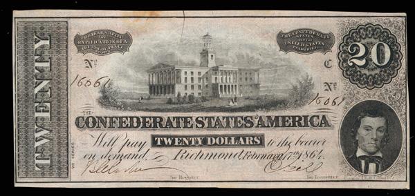 Group of (8) Fr. T-67 1864 $20 Confederate States Of America CSA Bank Notes (Fr-T-67) (5) notes in AU-UNC condition (3) notes in F-VF condition; please inspect (8). (PDF for this Lot) (Image)