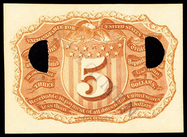 Fr. 1232 5¢ Second Issue Uniface Back Specimen (Fr-1232), Uniface back specimen, punch canceled, rubber stamped "SPECIMEN", produced in the fall of 1863 to test the printing qualities of various types of paper, Choice VF to XF condition or better. (Image)