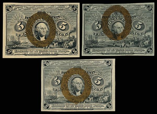 Fr. 1232 5¢ Second Issue Fractional Trio (Fr-1232), Rothert-17. Lot of 3 notes, all without small overprint on corners of reverse. All are Choice VF to Choice XF condition or better. (3). (Image)
