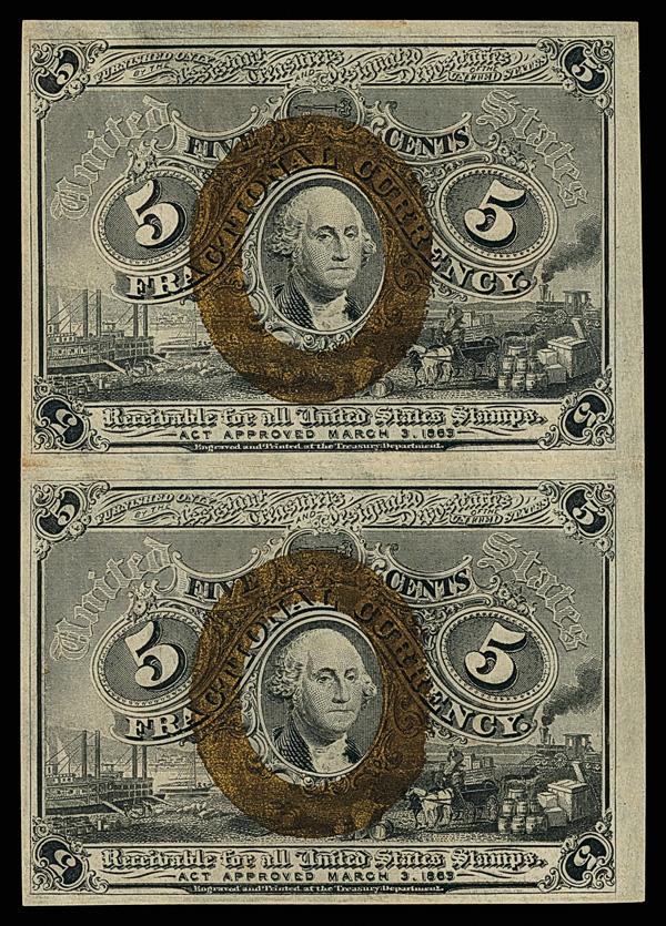 Fr. 1233 5¢ Second Issue Uncut Pair (Fr-1233), Rothert-18. Vertical pair, with overprint on reverse. Choice XF to AU condition or better. (Image)