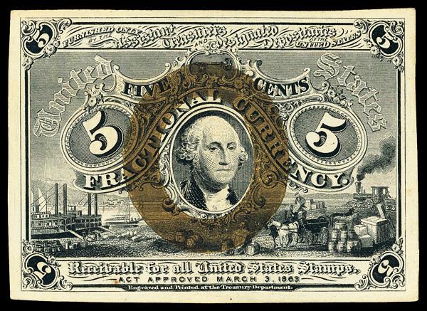 Fr. 1233 5¢ Second Issue (Fr-1233), Rothert-18. Small surcharge on corners of reverse. Choice XF to AU condition or better. (Image)