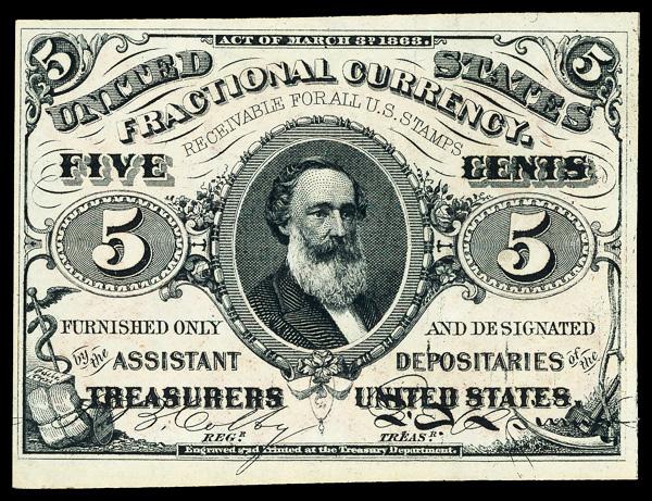 Fr. 1236 5¢ Third Issue (Fr-1236), Rothert-45. Portrait of Clark at center, red back, Choice VF to XF condition or better. (Image)