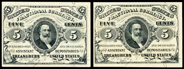Fr. 1232 5¢ Second Issue Uniface Obverse & Reverse Specimen Pair (Fr-1232), Specimen pair, watermarked CSA, with "SPECIMEN" on blank back, Choice VF to XF condition or better. (Image)