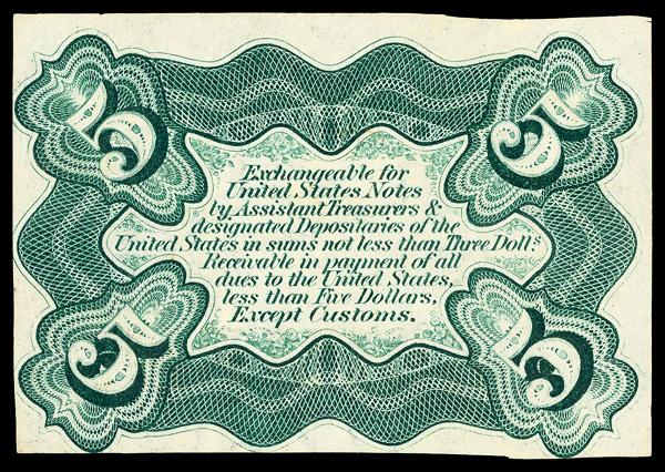 Fr. 1238 5¢ Third Issue Uniface Reverse Specimen (Fr-1238), Uniface specimen of reverse. Green printing, uniface, Choice XF to AU condition or better. (Image)