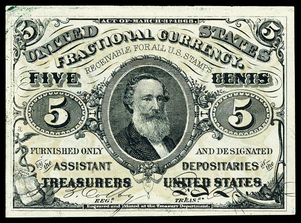 Fr. 1238 5¢ Third Issue (Fr-1238), Rothert-47. Portrait of Clark at center, Green back, Choice XF to AU condition or better. (Image)