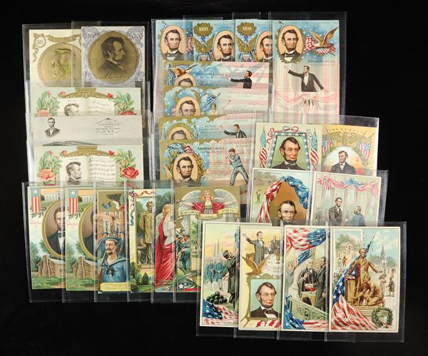 United States, Premium Lincoln postcards 1909-1912, 27 of the most beautiful Lincoln anniversary of his birth or death postcards; about half have been postally used around the turn of the century; overall condition is quite good; minimal duplication noted; stunning, Fine to Very Fine. Shipping charges apply - weight 1 lbs. (PDF for this Lot) (PDF2 for this Lot) (Image)