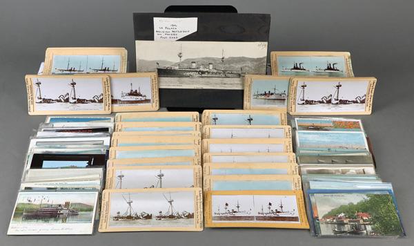 United States, Naval stereographs and postcards 1904-1940, 55 turn of the century stereographic cards (many colorized) showing mostly US warships including several illustrating the wreckage of the USS Maine; stunning 1906 Belgian battleship (Le Pelayo) folded postcard (postally used); plus about 50 postcards, most pre-1920 and postally used; quality lot, Fine to Very Fine. Shipping charges apply - weight 3.8 lbs. (PDF for this Lot) (PDF3 for this Lot) (Image)