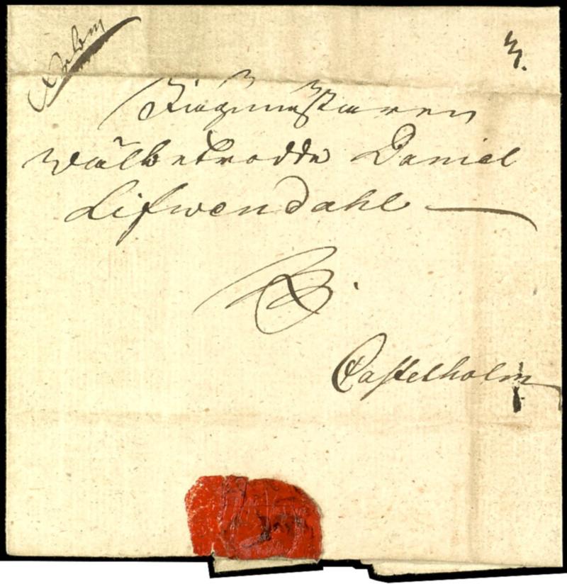 1788, Dienstbrief (Kartierungsnummer 3) mit Portofreiheit aus ABO nach CASTELHOLM, handschriftlicher Vermerk "Fr.br". Innenseitiger Vermerk "Eingeliefert am Postpunkt GÖLBY am Sonntag dem 28.8.1788 und damit 3 Monate auf dem Weg". Bug im Oberteil, vermutlich blieb der Brief unbemerkt in einer Posttasche hängen und wurde in Gölby abgeholt (Image 1)(Image)