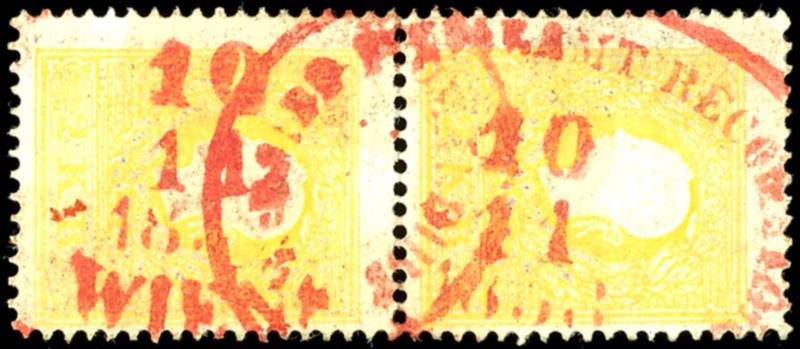 2 Kreuzer Franz Joseph, type I dark yellow, horizontal pair with 2 red oval cancels "K. K. MAIL OFFICE RECOMANDIRT Vienna 10 / 11 18 / 58" ; expertized and photo expertize Dr. Ferchenbauer VOEB: "genuine, the stamps are complete, the design of the stamp is to at the bottom on the right off-center. It is a superb item", Fb 2.000.- (10Ib(2)) Certificate