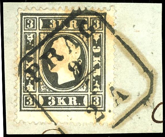 3 Kreuzer Franz Joseph, black, type Ib, plate flaw "bulldogs head" on piece, clear framed four line cancel "Prague", sound, expertized Wallner, Michel 500.- (11IbPFI)