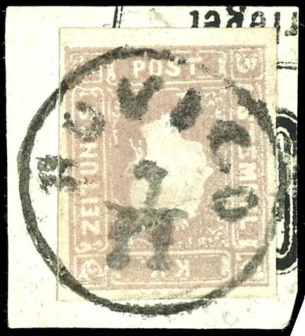 6 Kreuzer brown, handmade paper type Ia, double cancellation two ring cancel "TRIEST 16 / 6" and "Villach 18 / 6" on piece with postage stamps added to cover to pay postage due 3 Kreuzer rose red, handmade paper type Ia, with clear two-line cancel cursive handwriting stamp "Villach 18 JUNY", interesting combination, photo expertize Steiner VOEB (2020) "both stamps with wide margins and fresh colours, horizontal break through letter piece and stamps" (4,3Xa) Certificate