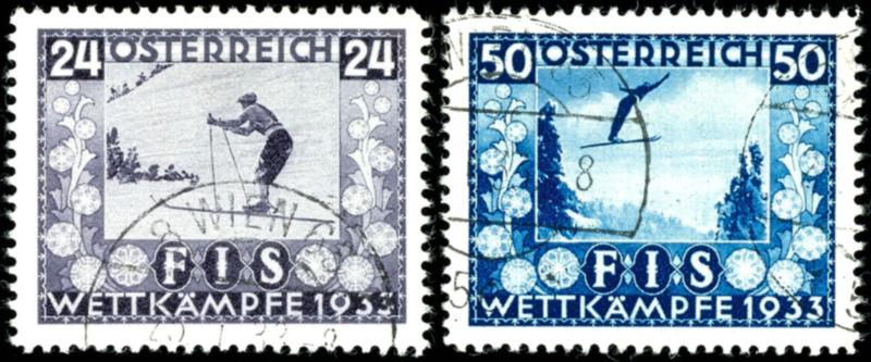 1936, 2 picture postcards with topic "BSV Danube" airplane and stagecoach over Austrian map. Both cards unmailed used with special cancel and green respectively red vignette.