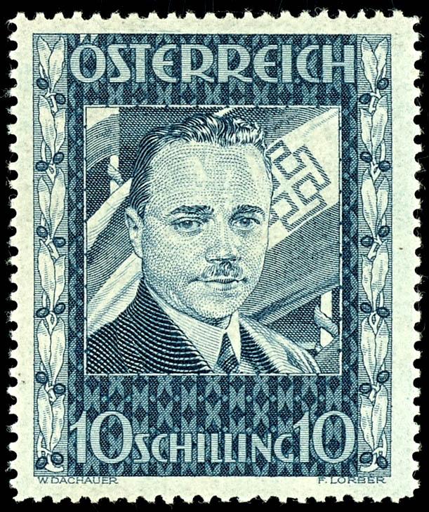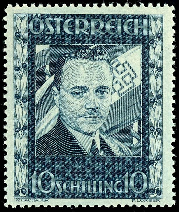 1934, 10 Shilling Dollfuss, phase print "43" only from flag and laurel in lilac carmine, imperforated single copy in the souvenir sheet format approximate 80 x 103 mm on ungummed paper, very fine, photo expertize Roger Soecknick BPP (2013) "genuine and immaculate" (588Ph) Certificate